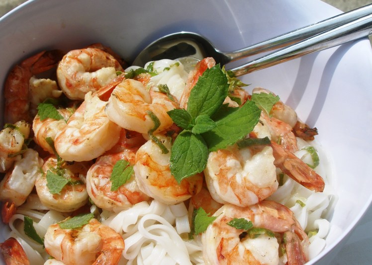 - Remove shrimp from the grill and toss immediately with the dressing. Pour the shrimp and dressing over the rice noodles. Serve warm or cold.
