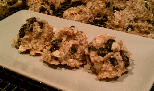 In a large bowl, stir together the dry ingredients, plus the dried blueberries. In another large bowl, mash together the bananas, oil, and vanilla. Pour the banana mixture over the oatmeal mixture and stir until just combined. Drop tablespoons of the cookie dough onto parchment lined baking sheets. Bake at 350 degrees F for 15 minutes. They should be lightly browned. Transfer to a wire rack to cool.