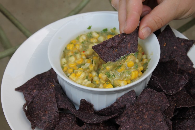 I recently came up with a couple of simple salsas that I wanted to share. One, a combination of tart tomatillos and sweet corn, the other made with ripe tomatoes and peaches, each flavored with chili peppers and herbs from the garden. Use them for dip, or on top of a piece of grilled fish or meat, or just enjoy them by the spoonful!